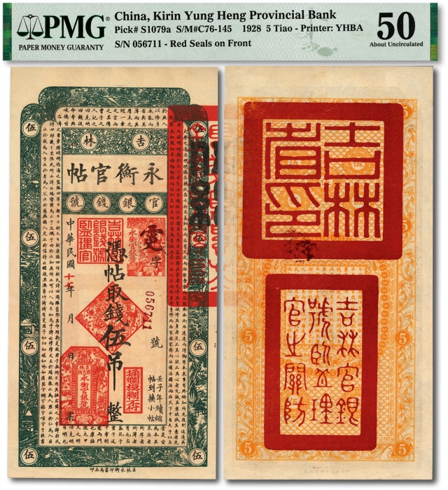 民国十七年(1928年)吉林永衡官帖伍吊,纸张硬挺,纹理清晰,色彩浓郁明艳,原汁原味,品相极佳,资深藏家旧藏,九八成新(低评)