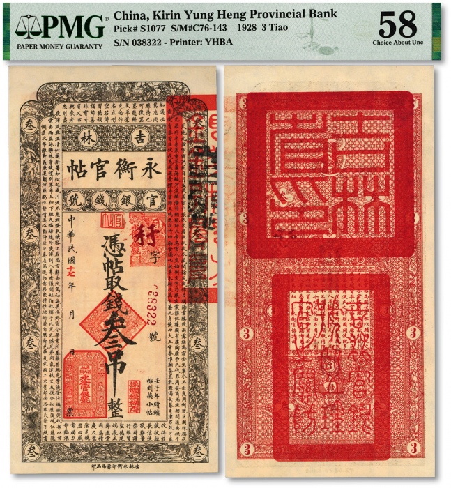 民国十七年(1928年)吉林永衡官帖叁吊,纸张硬挺,纹理清晰,色彩纯正明丽,原汁原味,品相极佳,资深藏家旧藏,九八成新(低评)
