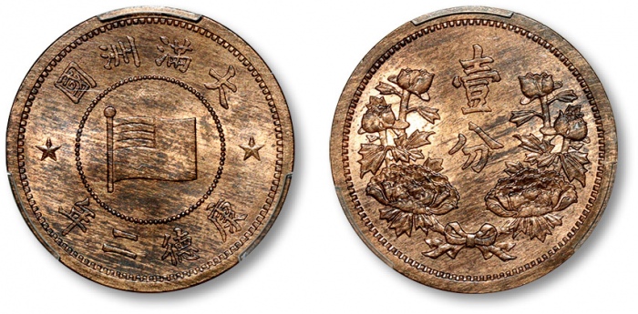 CHINA. Manchukuo. 5 Fen, Year 3 (1936). Kangde (Puyi). PCGS MS-64. KM-Y-7. A pleasing, satiny specimen with light russet and gold toning, particularly on the obverse.