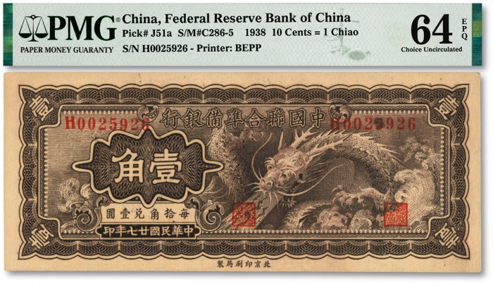 民国廿七年(1938年)中国联合准备银行小龙壹角,纸张硬挺,纹理清晰,凹凸明显,色彩醇厚浓郁,品相极佳,十分难得,资深藏家旧藏,全新(仅10枚之殿军分,更高分仅20枚)