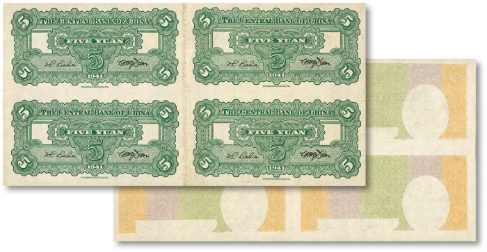 民国三十年(1941年)中央银行中华版伍圆4枚联体钞,未完成券,少见,纸张白净硬挺,纹理清晰,色彩明艳,原汁原味,九八成新
