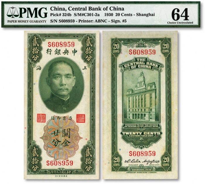 民国十九年(1930年)中央银行关金廿分,单字轨,上海地名,凹凸感强烈,九八成新(冠军分)