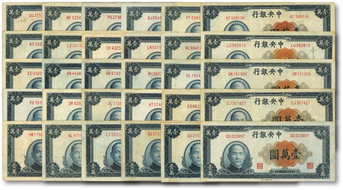民国三十六年(1947年)中央银行中央上海厂蓝色壹万圆共30枚,雕刻板纹路明显,包浆自然,原汁原味,八五至九成新