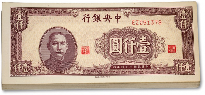 民国三十四年(1945年)中央银行保安版壹仟圆,纸张硬挺,雕刻版纹路清晰,色彩浓郁纯正,全新(亚军分)
