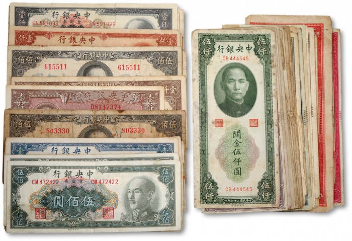 中央银行纸币共20枚不同,详分:1928年上海壹圆4枚、上海拾圆3枚,1940年上海伍圆4枚,中华版1940年拾圆,华德路版1936年壹圆,德纳罗版1936年壹圆、1942年拾圆2枚、壹仟圆2枚、1944年伍拾圆;保安版1945年壹仟圆;状态自然,五至七成新