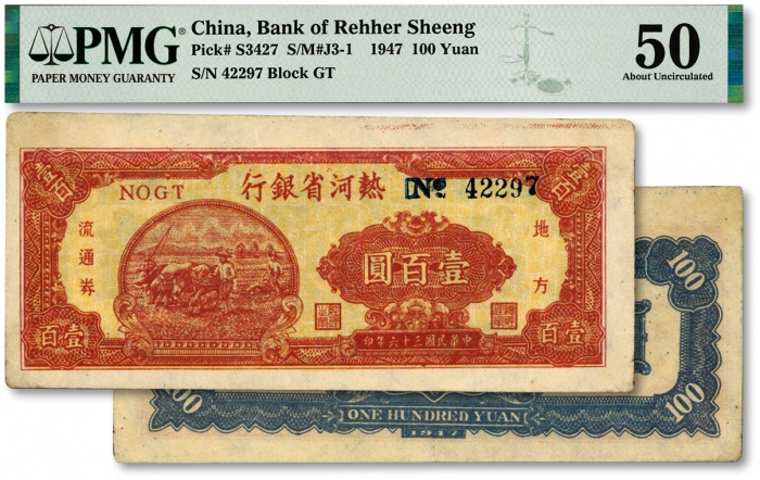 民国三十六年(1947年)热河省银行地方流通券壹百圆,纸张白净硬挺,纹理清晰,色彩明丽纯正,原汁原味,九八成新(严重低评,敬请观阅实物)