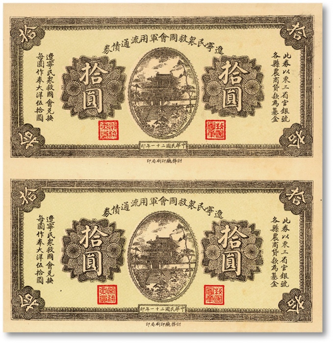 民国二十一年(1932年)辽宁民众救国会军用流通债券拾圆共2枚联体钞,未完成券,由东北义勇军唐聚五部印制,纸张硬挺,色彩浓郁鲜艳,全新