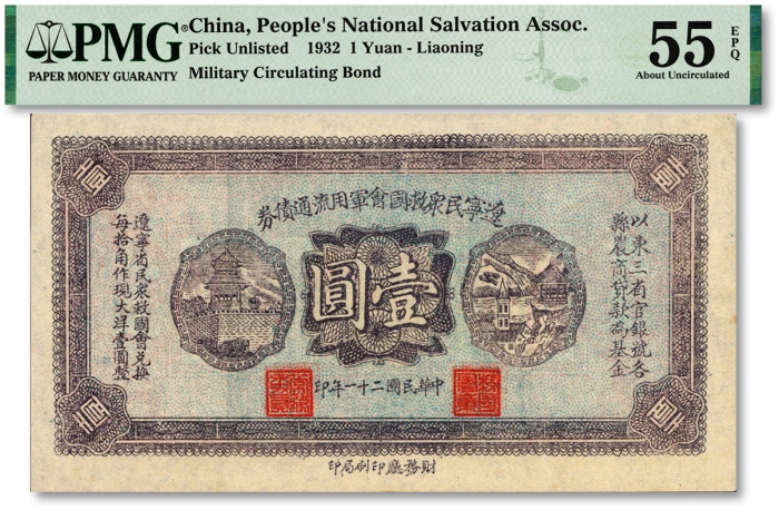 民国二十一年(1932年)辽宁民众救国会军用流通债券壹圆,薄纸版,东北义勇军唐聚五部发行,背盖“辽宁救国会璧”,内中文字为诸葛亮《后出师表》;纸张纹理明晰,色彩浓艳纯正,原汁原味,九八成新(低评) ...