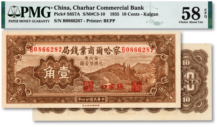 民国廿四年(1935年)察哈尔商业钱局壹角,纸张白净,色彩明丽,江南资深藏家出品,九八成新(严重低评)