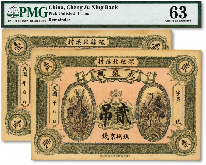 民国年(河北)深县北溪村·成聚兴玖捌京钱壹吊、贰吊共2枚全套,上印鹿鹤同春图,纸张硬挺,纹理清晰,色彩浓郁,原汁原味,九八成新