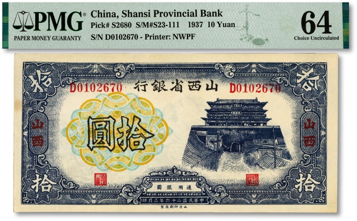 民国二十六年(1937年)山西省银行拾圆,山西地名,纸张硬挺,纹路清晰,色彩浓郁纯正,好品相,全新(低评,为数寥寥之季军分,更高分仅2枚)