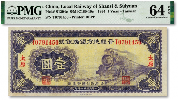 民国廿三年(1934年)晋绥地方铁路银号壹圆,太原地名,纸张硬挺,凹凸明显,色彩纯正,全新