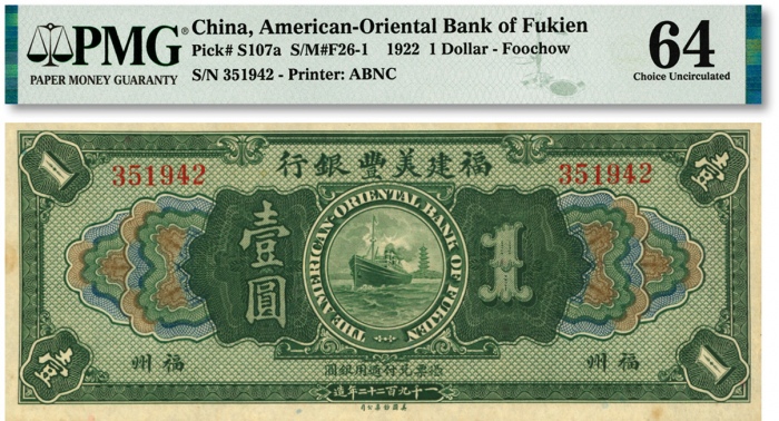 1922年福建美丰银行壹圆,福州地名,纸张纹理清晰,色彩浓郁醇厚,九八成新