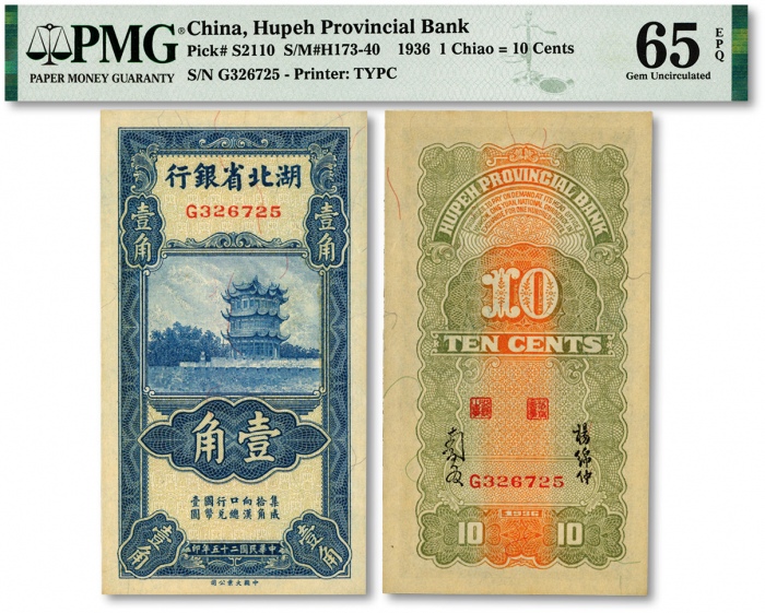 民国二十五年(1936年)湖北省银行壹角,背印南夔·杨绵仲签名,雕刻版纹路清晰,色彩明丽,资深藏家出品,全新(仅12枚之季军分,更高分仅5枚)