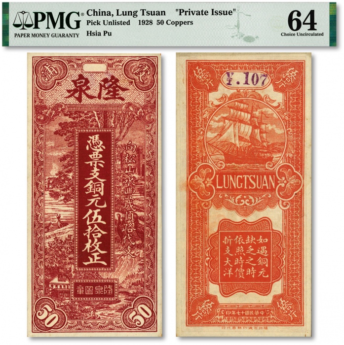 民国十七年(1928年)霞浦隆泉·凭票支铜元伍拾枚正,“福州百城印务局”印制,上印西式风景图,图案精美,纸张硬挺,色彩浓艳醇正,品相极佳,九八成新
