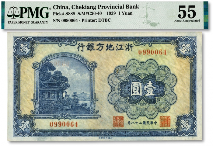 民国二十八年(1939年)浙江地方银行壹圆,无字轨,上印西湖放鹤亭图,江南资深藏家出品,九五成新