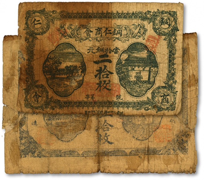 民国十二年(1923年)贵州·铜仁商会当拾铜元深绿色二拾枚、蓝灰色伍拾枚共2枚不同,有破损及贴补,六成新