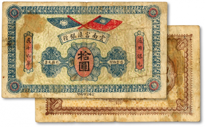 民国十八年(1929年)云南富滇新银行伍圆、拾圆共2枚不同,单字轨及无字轨,背盖“其命维新”之花押,七五至八成新