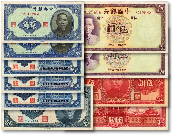 民国纸币共10枚不同,详分:中国银行1936年德纳罗版伍圆;中央银行中华吧1940年壹角,保安版1941年拾圆、壹百圆,中央上海厂1947年彩色布图伍仟圆,关金中央厂1948年伍仟圆4枚;中国联合准备