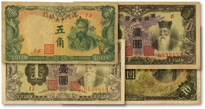满洲中央银行(1944年)丙号券伍角、壹圆2枚,日本军用手票拾圆,共计4枚,状态自然,原票八至八五成新