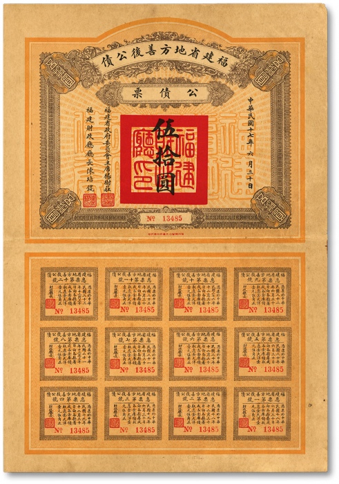 民国十七年(1928年)福建省地方善后公债伍拾圆,由福建省政府委员会主席“杨树庄”、财政厅厅长“陈培锟”共同签发,附带完整息票,少见,七五成新<br>编者按:杨树庄(1882—1934年),字幼京,福