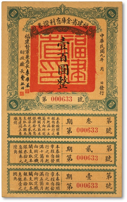 民国九年(1920年)福建省金库有利证券壹百圆,由福建督军兼省长李厚基发行,纸张硬挺,色彩浓郁纯正,少见极佳品相,全新