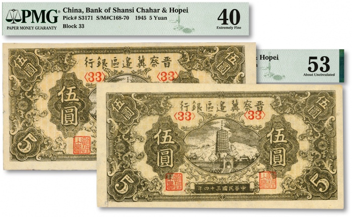 民国三十四年(1945年)晋察冀边区银行宝塔图伍圆共2枚,均为<33>号券,纸张硬挺,纹理清晰,色彩浓郁,未折九五成新(低评)