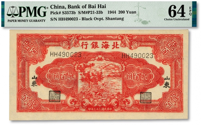 民国三十三年(1944年)北海银行红色锄地图贰百圆,纸张硬挺白净,纹路清晰,色彩艳丽,全新(为数不多之季军分,更高分仅14枚)