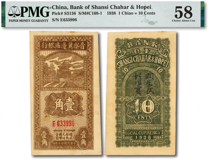 民国廿七年(1938年)晋察冀边区银行壹角,方体小号码券,十分少见,色彩浓郁,状态自然,九五成新