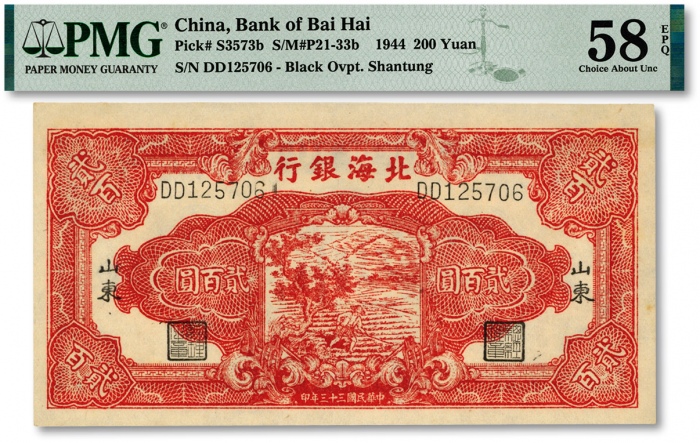 民国三十三年(1944年)北海银行红色锄地图贰百圆,纸张硬挺白净,纹路清晰,色彩艳丽,全新(为数不多之季军分,更高分仅14枚)