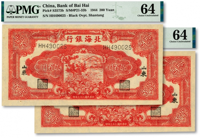 民国三十三年(1944年)北海银行红色锄地图贰百圆共2枚连号,纸张硬挺白净,纹路清晰,色彩艳丽,全新(低评)