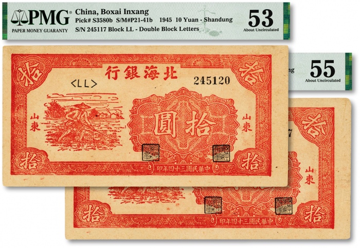 民国三十四年(1945年)北海银行红色锄地图拾圆共2枚,断续连号,纸张硬挺,纹路清晰,色彩浓郁纯正,原汁原味,九成新(严重低评,敬请观阅实物)