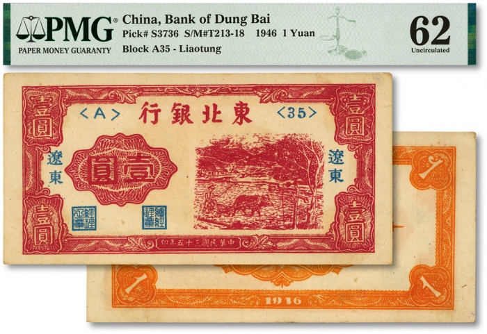 民国三十五年(1946年)东北银行壹圆,辽东地名,色彩浓艳,全新(季军分,低评)类似藏品价格参考
