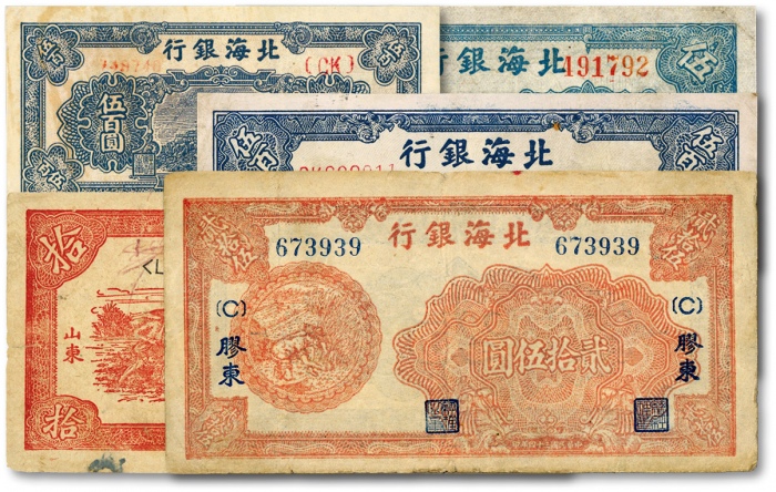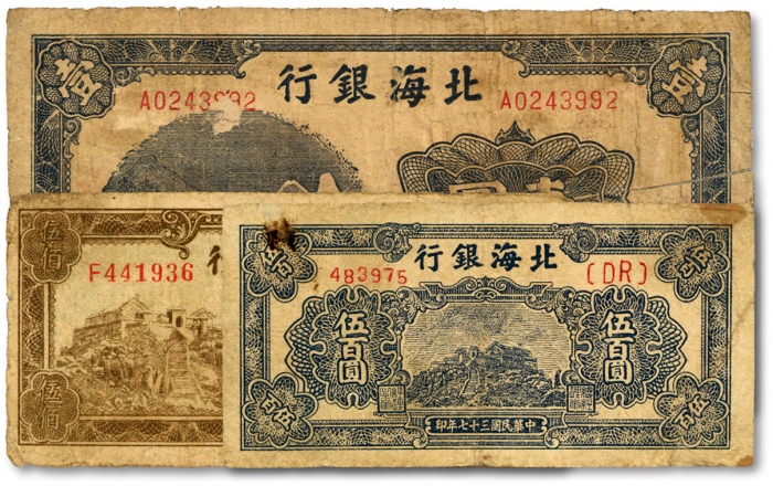 北海银行纸币共3种,详分:1942年蓝黑色山水风景图壹圆,1948年橄绿色泰山顶伍佰圆、蓝色泰山顶伍佰圆;其中1枚有贴补,余皆原票,六五至七五成新