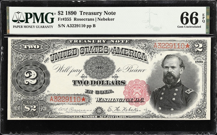 Fr. 355. 1890 $2 Treasury Note. PMG Gem Uncirculated 66 EPQ.Just a little over 140 examples of this elusive Friedberg number are known to collectors, according to Track and Prices census. This Rosecrans-Nebeker signed deuce displays the coveted small red s ...