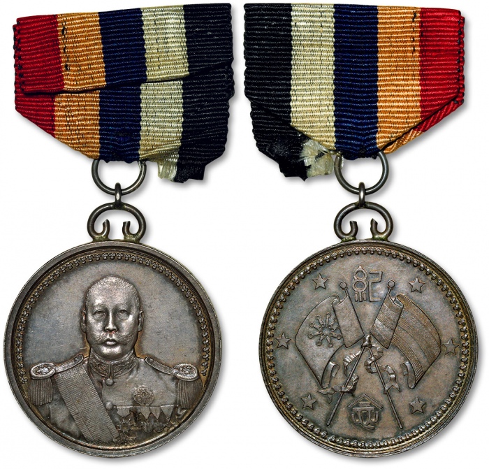 1923年曹锟武装像宪法成立纪念银章一枚,小型,此币铸造深峻精美,人像细腻生动,刻模纤毫毕现,底版光洁无瑕,压力十足,原味深灰色欧洲五彩包浆,带绶带,少见,状态极佳,十分难得,完全未使用品 ...