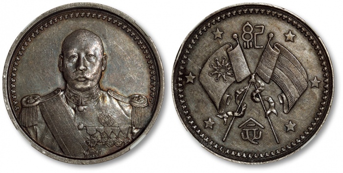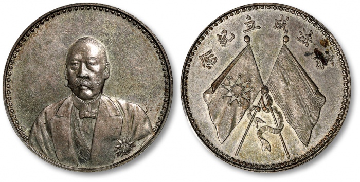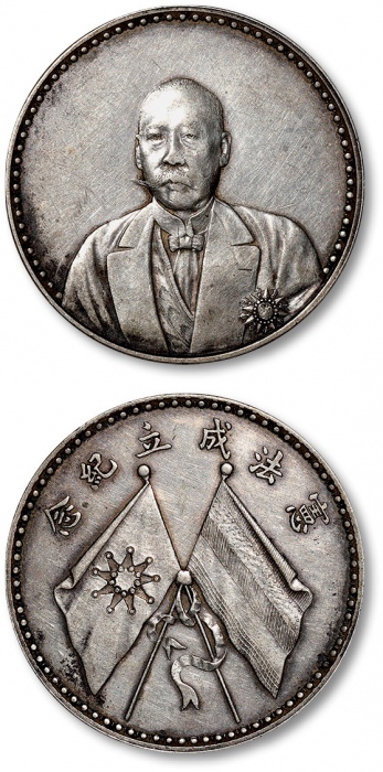 1923年曹锟文装像宪法成立纪念银币一枚,K-677/LM-958。人像高浮雕,细节清晰,底版平整,淡金色包浆,底光旋转柔亮,状态上佳。曹锟纪念币,是1923年北洋政府为了纪念曹锟当上北洋政府大总统而铸造的,发行量约为100枚。此币分为银质和金质两种,银质纪念币主要是赠给普通官 ...