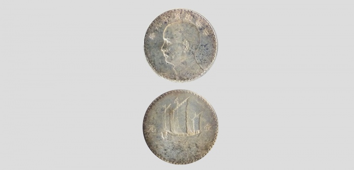 民国二十三年孙中山像背帆船壹圆银币一枚,打制深峻规范,底版平滑光洁,灰色环五彩包浆,底光柔亮,状态上佳,完全未使用品