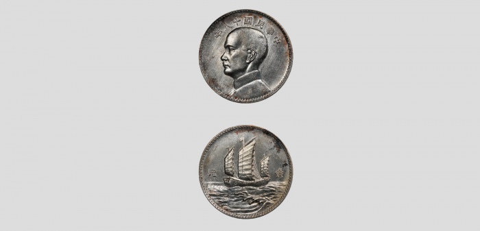 民国十八年孙中山像背三帆帆船壹元银币英国版样币,PCGS 43887163 SP58 ,3.89*0.26cm 27g
