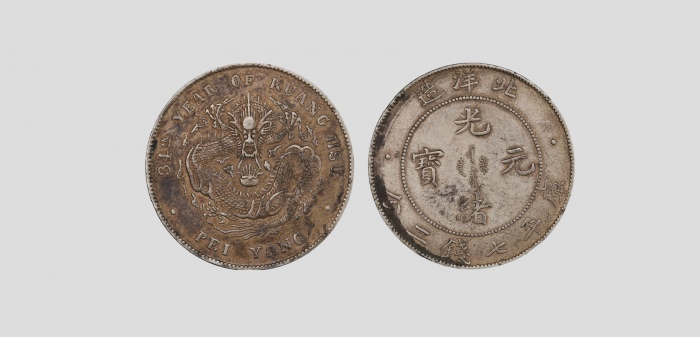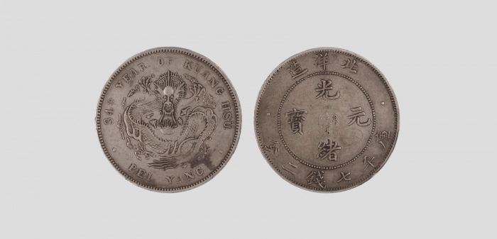1908清光绪三十四年北洋造光绪元宝库平七钱二分银币长尾龙,PCGS 83347023 AU50 ,3.9*0.24cm,26.8g