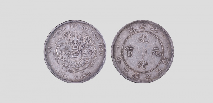 1908清光绪三十四年北洋造光绪元宝库平七钱二分银币长尾龙,PCGS 86090709 XF45 ,3.9*0.24cm,26.8g