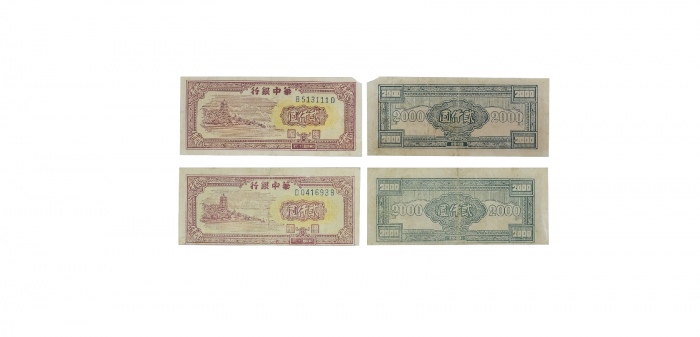 民国三十七年华中银行宝塔图二千元纸钞 一组2张 B513111D、D041693B,10.7*4.5cm10.7*4.6cm