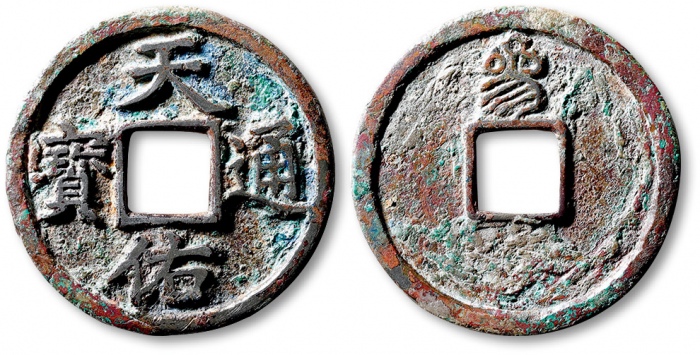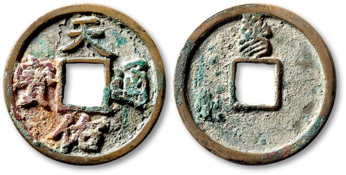 “天定通宝”折二一枚,直径:28.5mm,文字清晰,铸造精美,色泽绚丽,品相一流,极美品