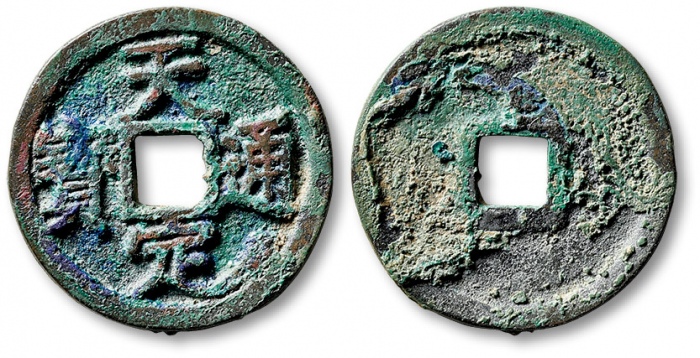“天定通宝”折三一枚,直径:32.2mm,钱体平整,字口挺拔清晰,包浆醇熟,海外回流,极美品