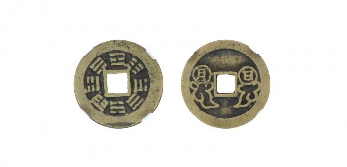 清日月祥云背八卦方孔花钱,华夏评级 极美85 ,2.5*0.11cm 3.8g