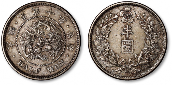 朝鲜光武十年半圆银币一枚,打制规范,图案清晰,灰色包浆,极美品