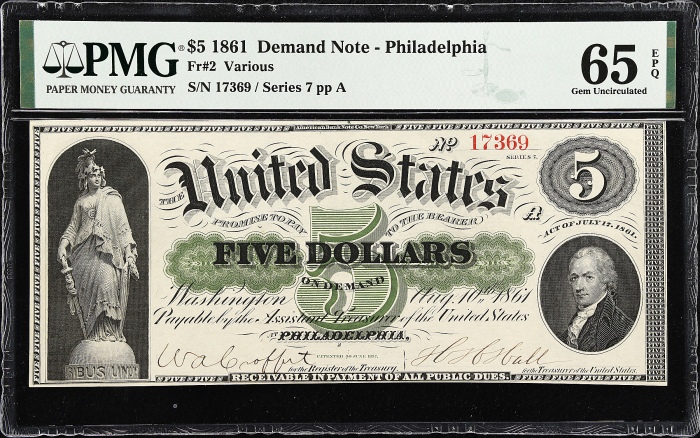 Fr. 2. 1861 $5 Demand Note. PMG Gem Uncirculated 65 EPQ.This is an exceptionally lovely note for <em>any</em> large-size type, but as a Demand Note, it is arguably among the most important survivors in all federal currency.<p><p>Though the original issue o ...