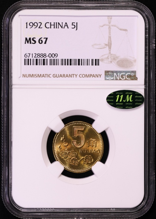 第200288号:1992年普制5角 NGC MS67(11M绿标),估价:1500--2500