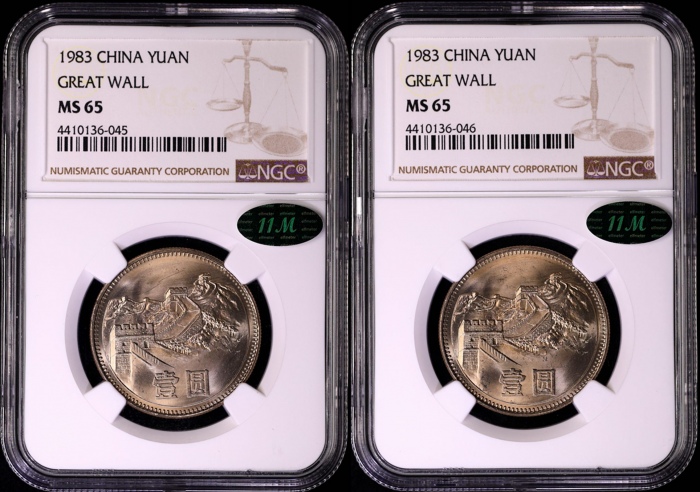 第200180号:1983年普制长城1元2枚 NGC MS65(11M绿标),估价:1500--2500