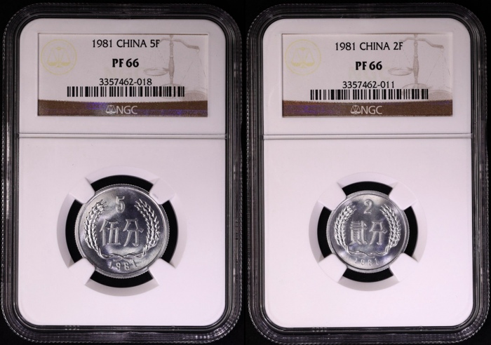 第200134号:1981年普制5分/2分 NGC PF66(老标),评级串号连续,红皮本拆出,5分为稀少版别分币,五大天王之一。估价:13000--20000